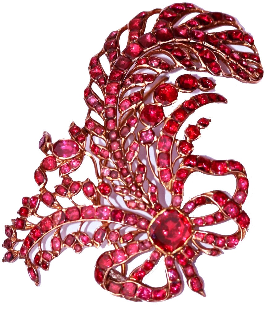 For me the allure of Georgian jewellery is not only to do with the workmanship and ingenuity, it’s also about those colours, the intense, delicious, candy like colours which are so visually appealing. This is an aigrette hair ornament with brooch fitting, circa 1780, designed to be worn on a wig or as a bodice ornament. It is the form of a beribboned feather. The aigrette is gold and set with shimmering almandine garnets over rose-pink foil in closed back settings. It measures 3 inches by 2 inches. Quite delicious.