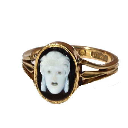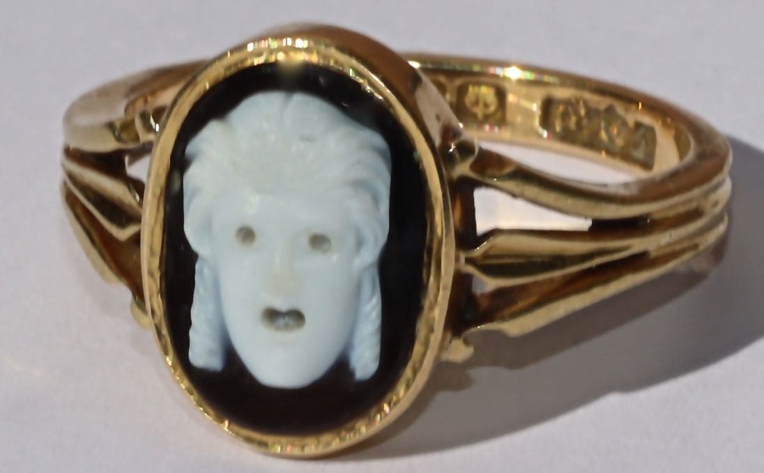 An 18 carat gold ring hallmarked for Birmingham 1911 and set with an agate cameo carved in two strata of a Bacchic theatre mask. Bacchus or Dionysos was the god of wine, fertility, festivity and theatre. Wine had a religious focus in the cult of Bacchus, it could ease suffering, bring joy, and inspire divine madness. Festivals of Bacchus included the performance of sacred dramas enacting his myths, the initial driving force behind the development of theatre in Western culture. The ring is size L [US 5 and 1/2] and can be sized. Well carved and immaculate.