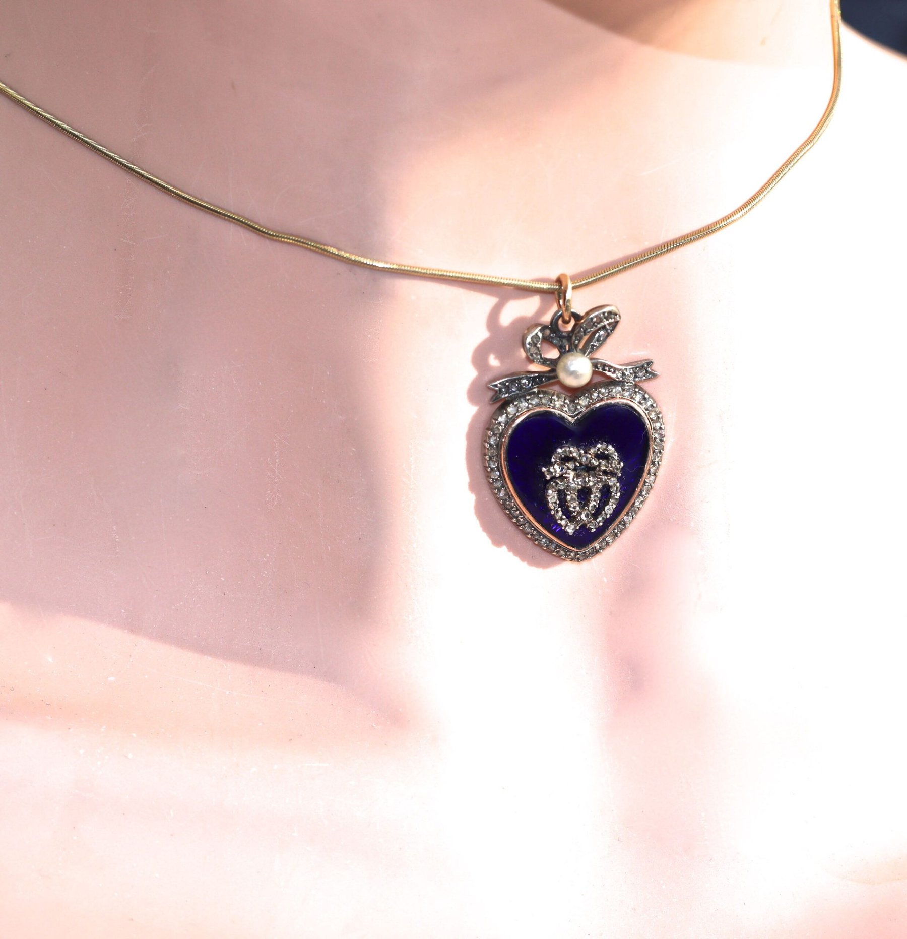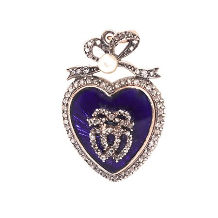 A high carat gold and silver love token heart pendant, circa 1840. It is set with a plaque of royal blue enamel surmounted by intertwined diamond hearts, within a surround of rose-cut diamonds. The heart is surmounted by a bow-ribbon set with rose-cut diamonds and a natural pearl. The pendant measures 1 and 1/3 inches by 3/4 of an inch. The term ‘royal’ blue was first used around 1810 when King George III contested clothiers across the country to create a colour shade suitable for utilisation by royalty. A firm of clothiers in Somerset won the competition and the triumphant hue was chosen for a robe for Queen Charlotte. As royal blue gowns became de rigeur, so did royal blue jewels to complement them. Very fine quality, immaculate.