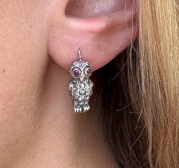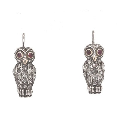 Diamond owls Diamond owls Sweet little diamond owl earrings, circa 1890. They are gold and silver and pavé-set with old-cut diamonds and have ruby eyes. The ear wires are gold. They are 3/4 of inch in length and immaculate. £1950 Item ref : 8902 back to earrings