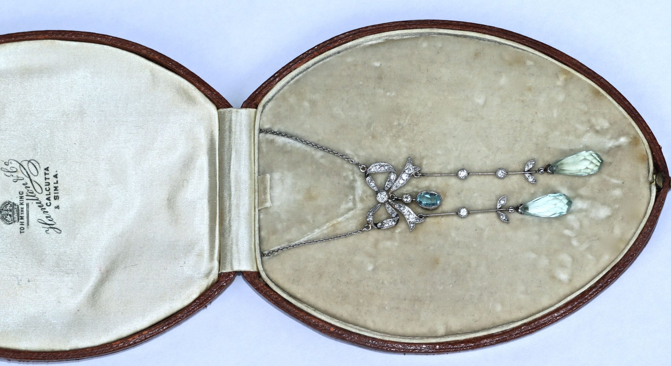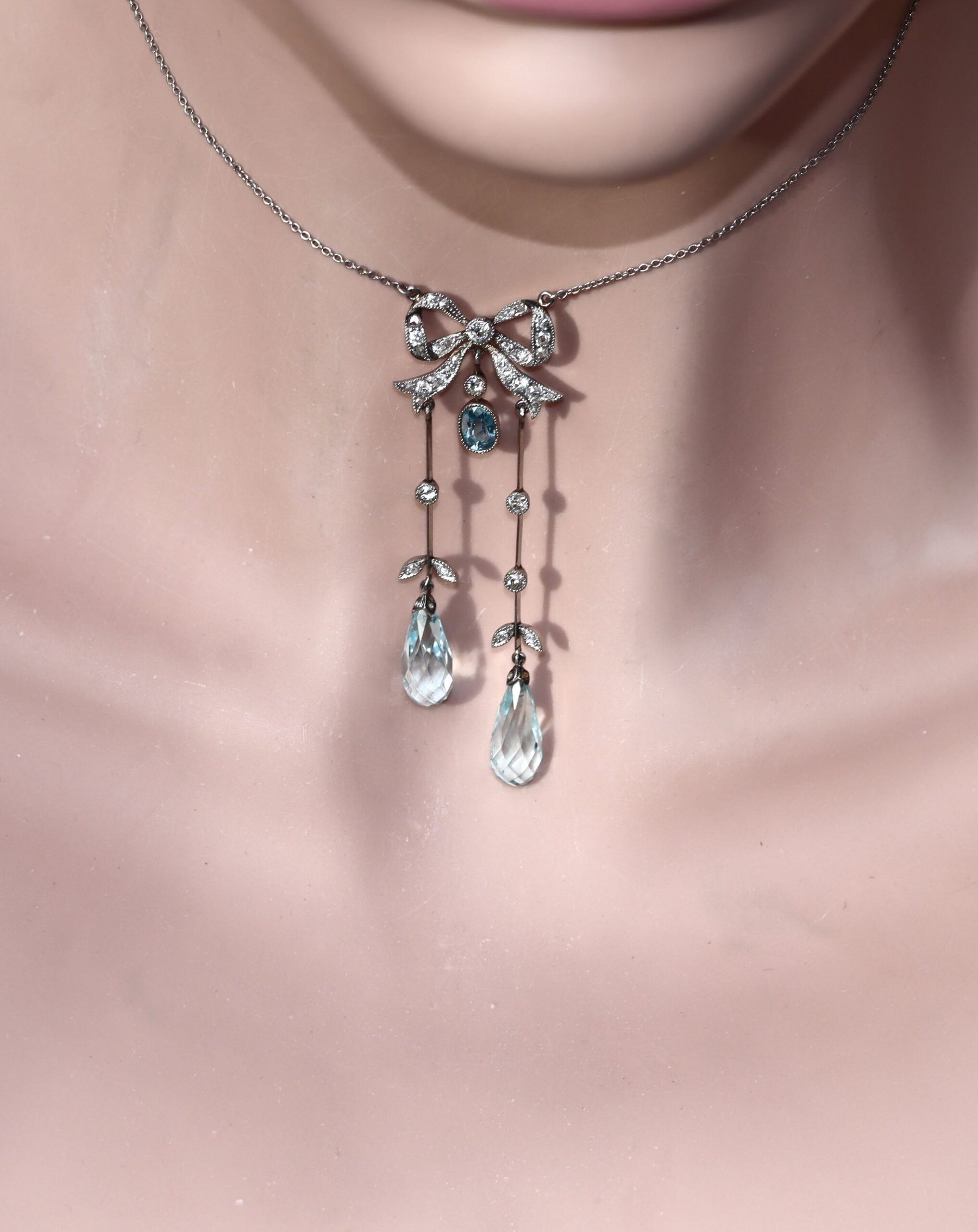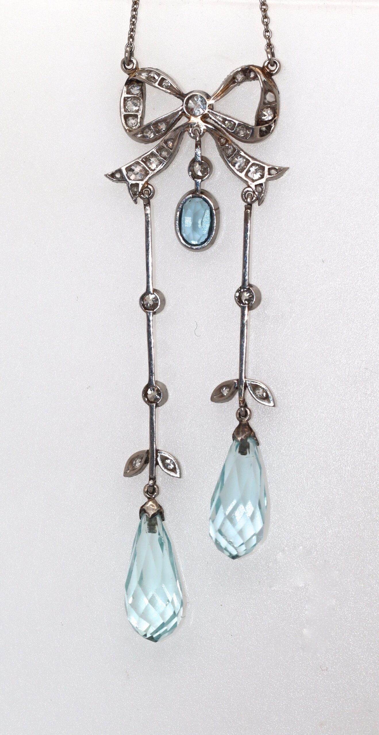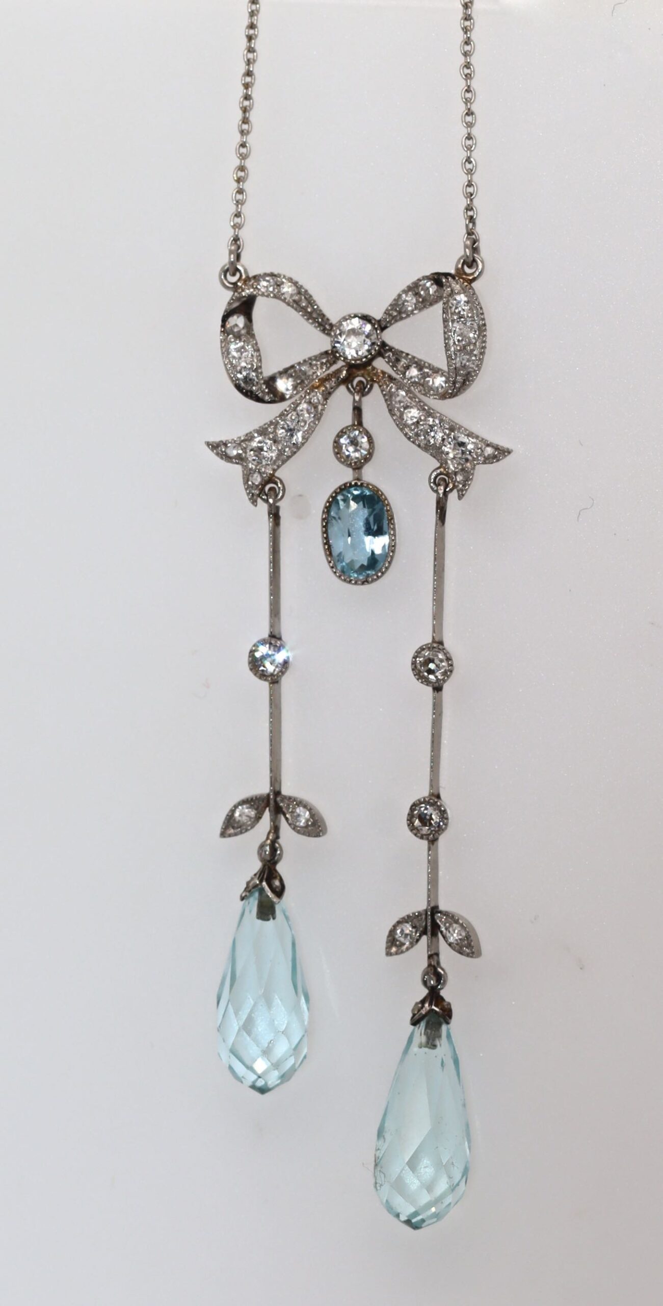 Pretty Edwardian pendant, circa 1910. It is platinum and in the form of a bow set with old-cut diamonds and aquamarines, with articulated briolette aquamarine and diamond drops. The necklace is 16 inches long and the centre gem-set section is 2 and 1/4 inches in length. In its original fitted case and immaculate.
