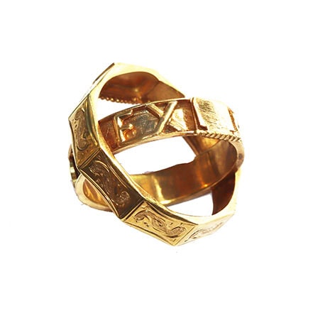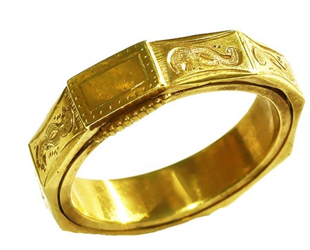 A most unusual high carat gold ring within a ring, circa 1840. The outer hoop is engraved and swivels open to reveal an inner ring emblazoned with the word ‘Excelsior’. The Latin word ‘Excelsior’ means ‘Ever upward!’, an 18th century exclamation or encouragement to strive for excellence or something of superior quality. The ring is size M [US 6] and the hoop is 1/4 inch wide. Such an ingenious ring with such a positive message, in immaculate condition.