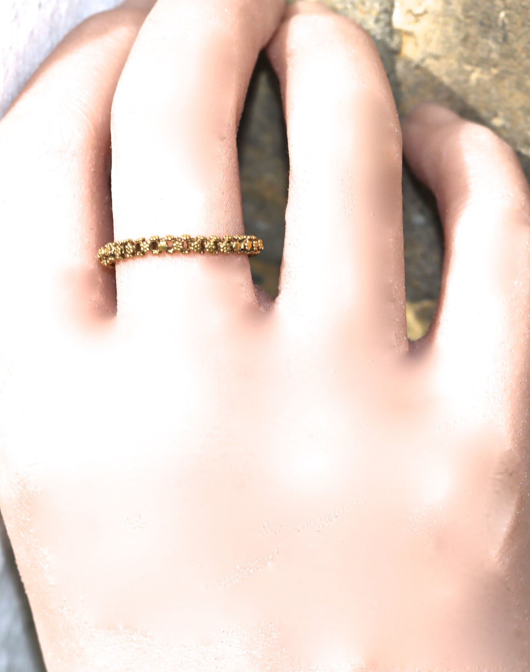 Georgian chain ring Georgian chain ring An original Georgian chain ring circa 1820, a fluid circle of 18 carat chain set with flowers. The ring is O [US 7 and 1/2]. I haven’t seen one of these for years. Immaculate. sold Item ref : 1805 back to rings