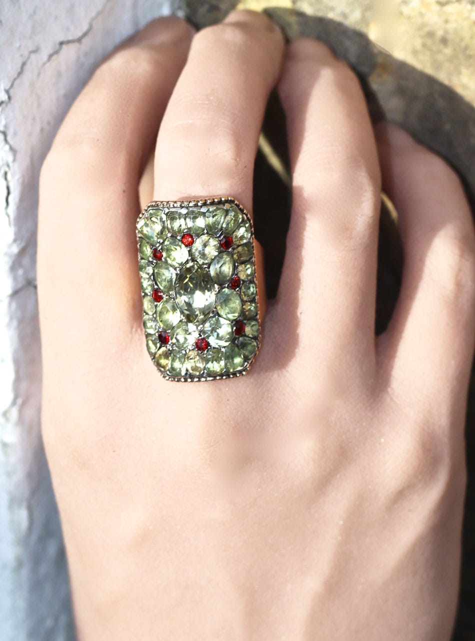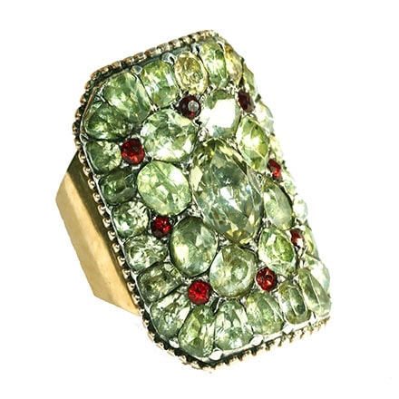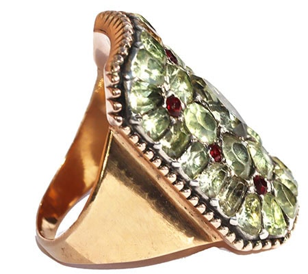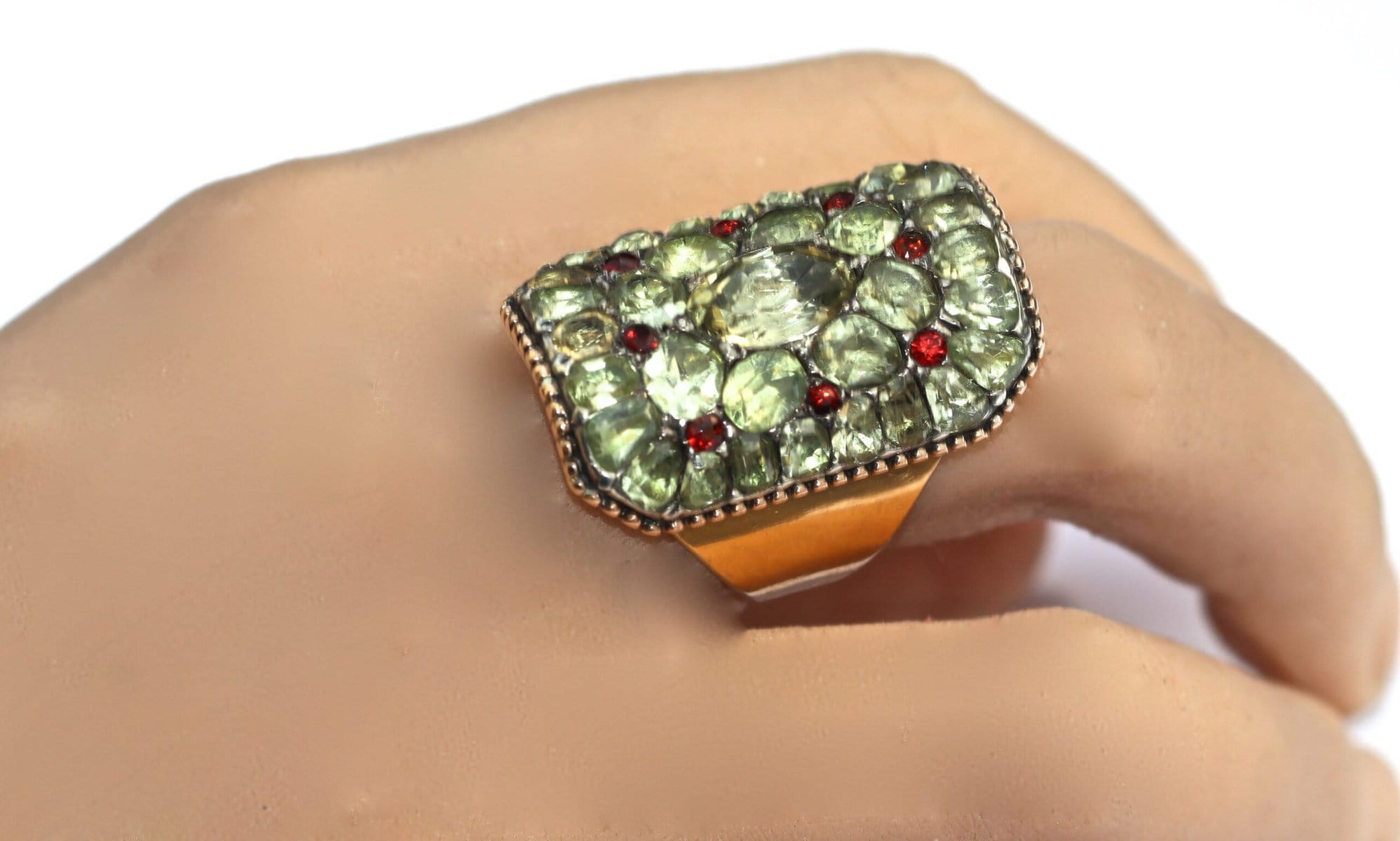 Fine quality Portuguese chrysoberyl plaque ring, circa 1780. The tapered high carat gold shank supports a curved plaque densely pavé-set with vivid sea-green chrysoberyl, interspersed with garnets. There is typically Portuguese gold bead detail to the surround. The ring is size R [US 8 and 5/8] and can be sized. The head of the ring measures 1 and 1/8 inches by one inch. The ring sits well on the finger due to its curved shape and is immaculate.