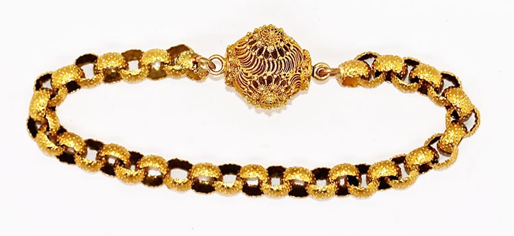 Georgian gold bracelet Georgian gold bracelet An 18 carat gold belcher link bracelet circa 1820. The textured links are attached to a cannetille ball clasp. The bracelet is 7 inches long and weighs 9.4 grams. Immaculate. sold £1650 Item ref: SC3 back to bracelets