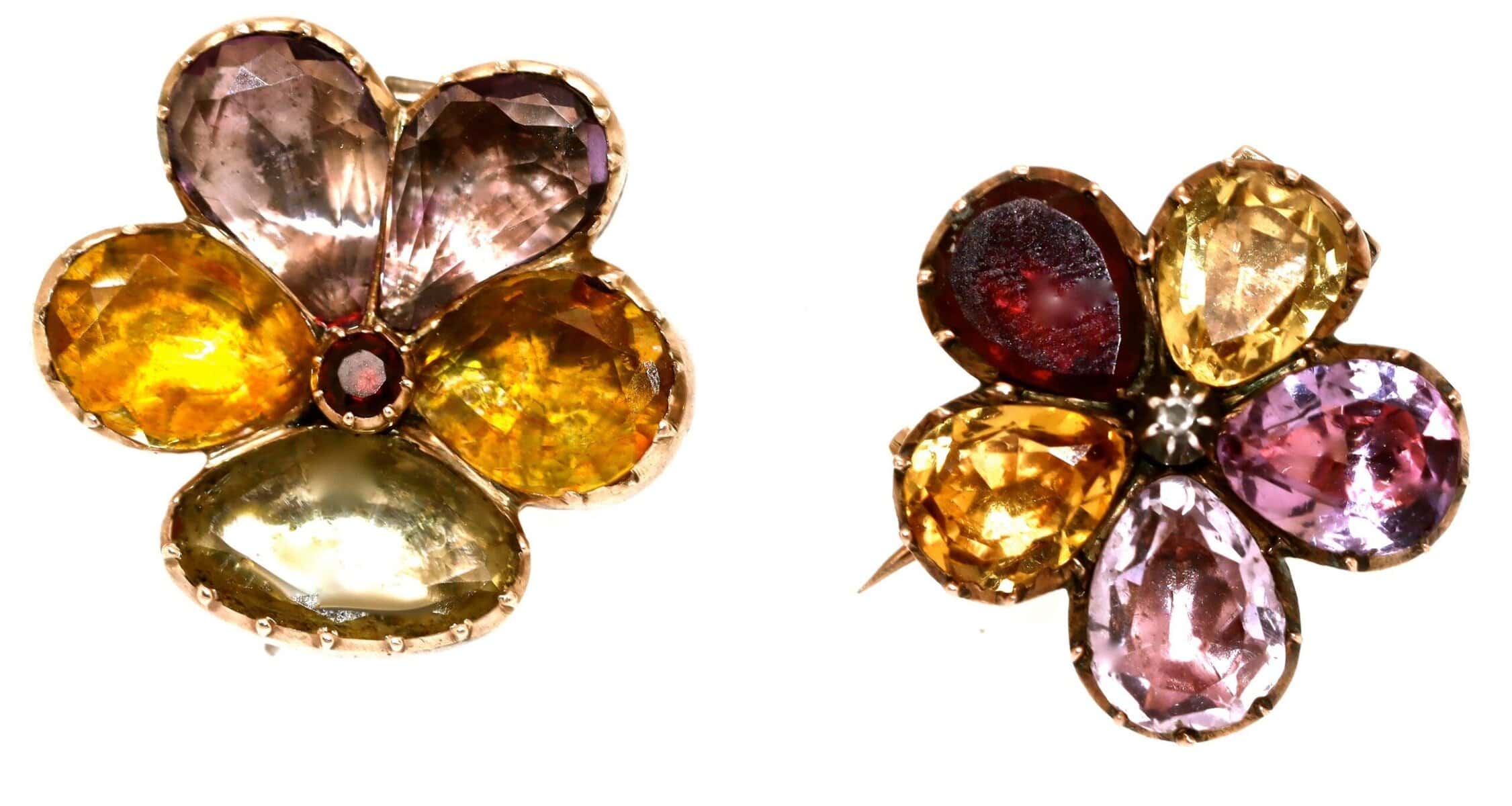 Two delightful harlequin pansies, circa 1800, illustrated on page of 141 of the publication Georgian Jewellery. Harlequin described the fashion for combining complementary coloured gems on pieces of jewellery. These two harlequin gems are in the form of pansies, symbolising pensée – think of the giver. They are both gold and set with amethysts, garnets and colourfully foiled rock crystal. The smaller one on the right measures 3/4 of an inch by 3/4 of an inch and the larger one on the left measures one inch by one inch. My jeweller can easily adapt the brooch pins so they can be worn as pendants if desired without compromising their original form. Delicious.