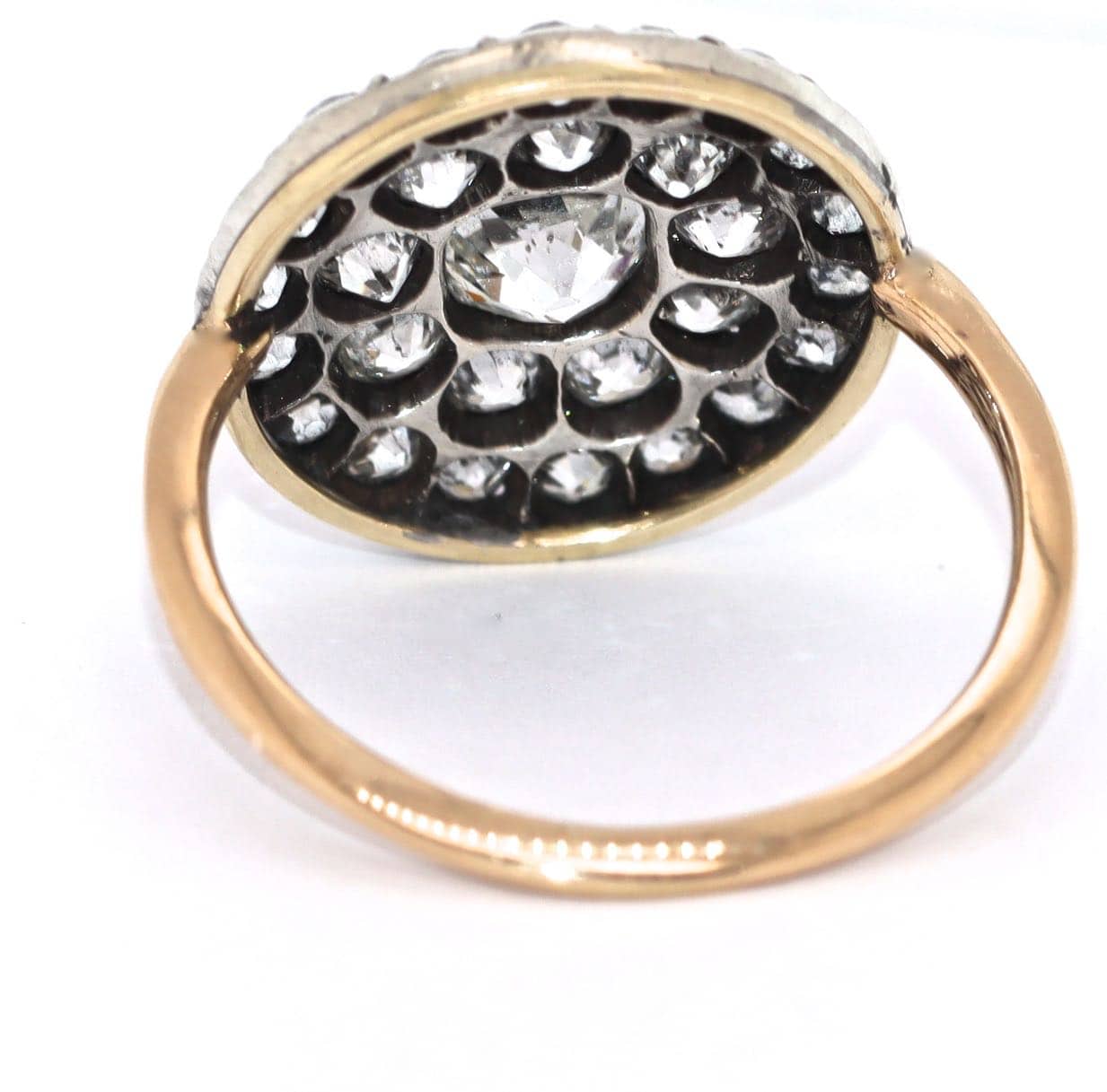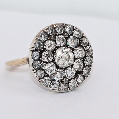 Luscious diamond cluster ring, circa 1840. The high carat gold hoop supports a cluster head of old-cut diamonds in open backed settings, all diamonds set silver. There are approximately 4.10 carats of diamonds in total, of I colour and VS clarity. The ring is size O and 1/2 [US 7 and 1/4] and can be sized and the head of the ring measures 2/3 of an inch by 2/3 of an inch. Utterly gorgeous ring.