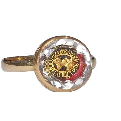 The high carat gold shank supports a compartment with a ground of woven hair and cerise-pink foil, surmounted by a bust of Queen Anne, in a gold wirework surround with motto God Save Queen Ann. It is covered by a faceted rock crystal. Anne is misspelt as Ann – this ring was made in an era prior to more standardised spelling, or perhaps the jeweller just ran out of room to include the final E. The ring is size O [US 7] and the head of the ring measures 1/2 an inch by 1/2 an inch. Very fine quality, completely original and immaculate. A one-off.