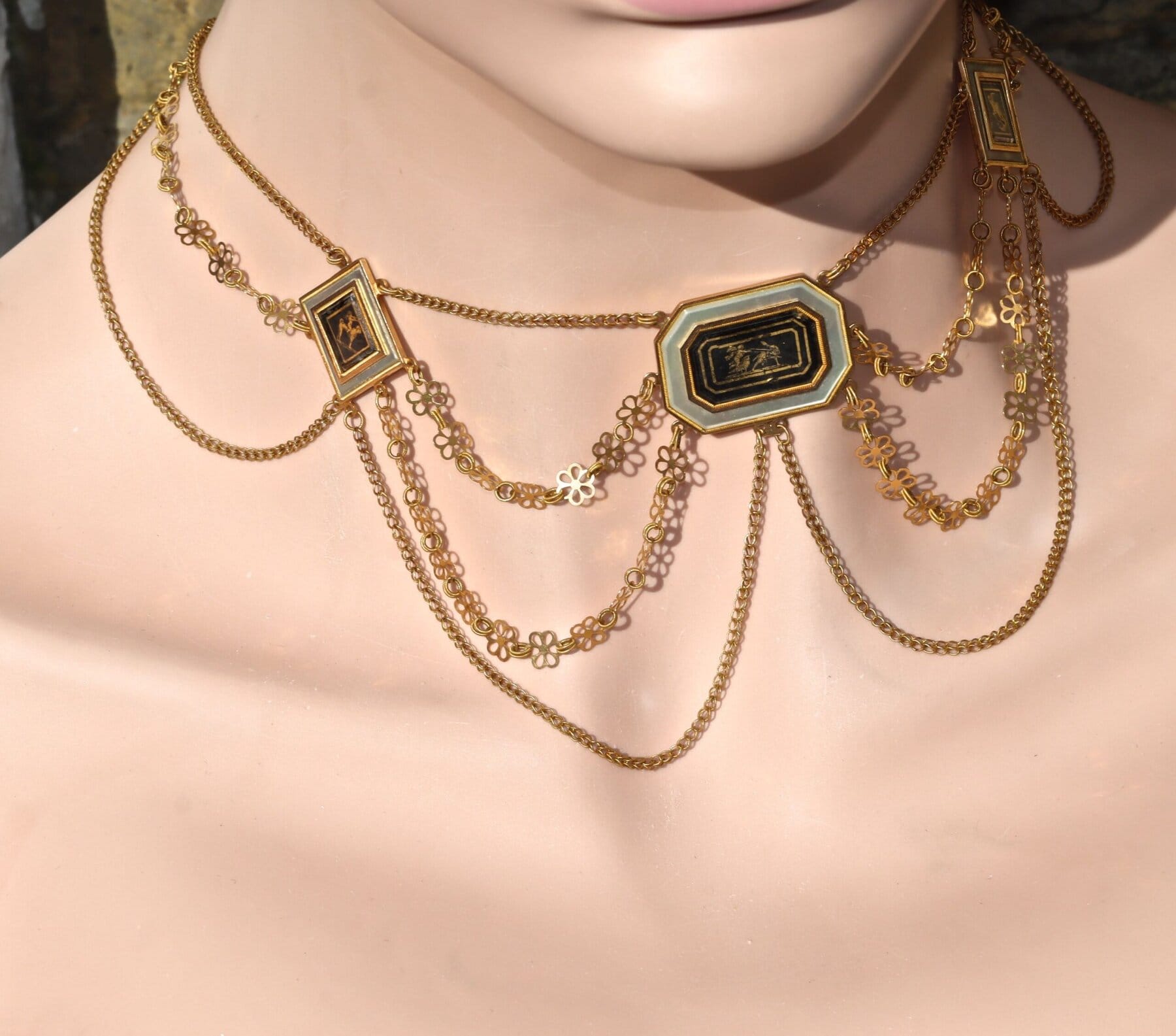 An 18th century 18 carat gold and verre eglomisé festooned necklace with a most intriguing provenance. It is illustrated on page 155 of the iconic publication Georgian Jewellery. The necklace is composed of an octagonal and two lozenge-shaped plaques, depicting faith, hope and charity in black and gold verre eglomisé within mother-of-pearl and corded gold frames, connected by delicate swags of 18 carat gold chain. It is 16 inches in length. The swagged gold chain has been artfully arranged so it sits beautifully on the neck. The necklace is immaculate.