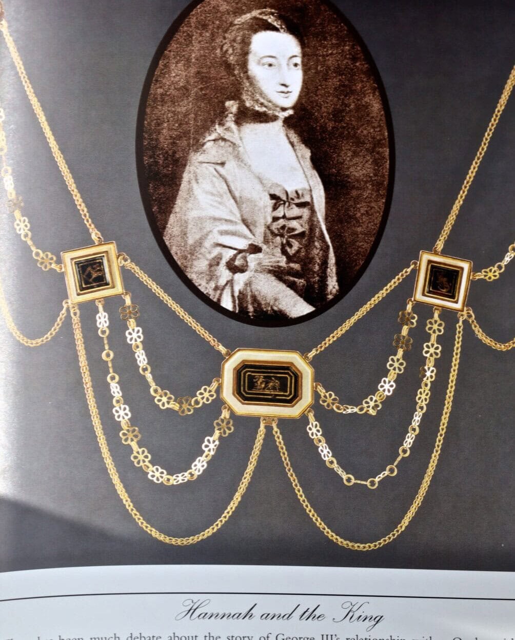 There has been much debate about the story of George III’s relationship with a young Quaker girl, Hannah Lightfoot. Their love affair is said to have begun whilst he was a young prince, producing two sons and a daughter and culminating in a clandestine marriage in 1759. Of the three progeny, the eldest son was given a Royal Warrant and sailed to South Africa in 1797. There he founded the town of Kynsna where he remained until his death in 1839. He never spoke of his lineage, the only reference to his royal association being in his name, George Rex. His will attested that all his surviving offspring were illegitimate due to his resolve never to marry their mother and many believe that this substantiates the story that George III’s last request to him was that he must never produce any legitimate heirs to undermine the British monarchy. George succeeded the throne in 1760 and in 1761 made Princess Charlotte of Mecklenburg-Strelitz his queen, with whom he had fifteen children. This necklace has been historically documented as having been given to Hannah Lightfoot by George III when he was Prince of Wales. It was passed down for generations in the family of George Rex. Whether the tale of Hannah and the King is truth or myth we will probably never know. Truth is often stranger than fiction.
