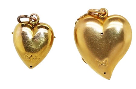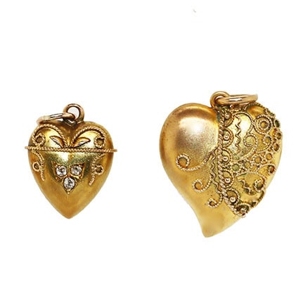 Two sweet little gold hearts, circa 1890. The larger is 9 carat gold and in the form of a witch’s heart decorated with cannetille gold overlay. It measures one inch by 2/3 of an inch including top loop. The smaller is 15 carat gold also with cannetille overlay and set with an old-cut diamond clover. It measures 3/4 of an inch by 1/3 of an inch including top loop. Both are immaculate.