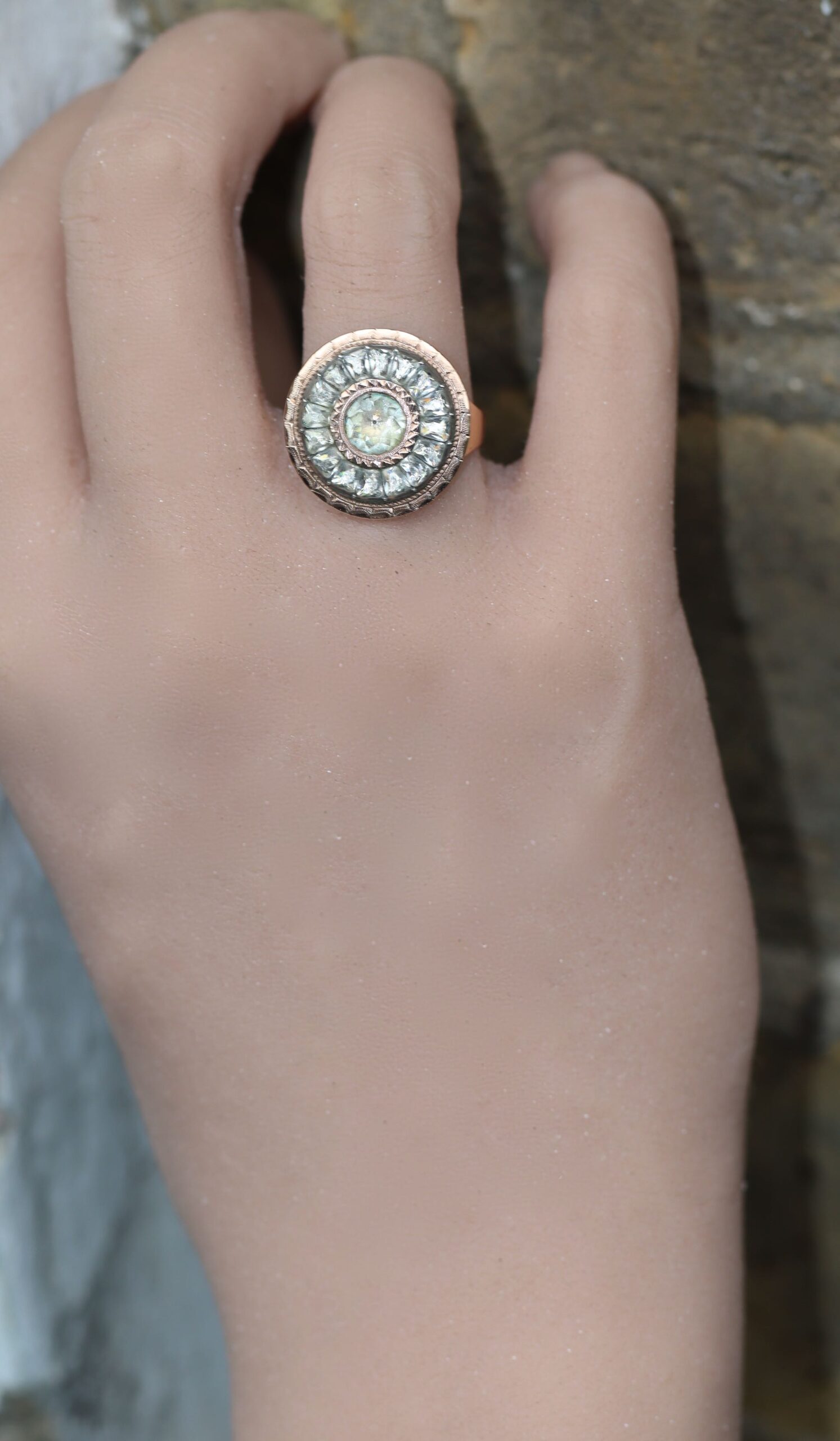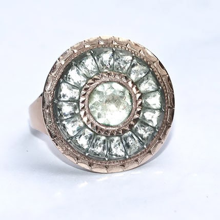 A 1920’s ring of Lazarus paste. Lazarus paste refers to the work of Harold A. Lazarus, a London jeweller who specialised in emulating Georgian paste, from around 1900. It is high carat gold and set with bright Lazarus paste in foiled and closed back settings, in the Georgian manner. The ring is size N and 1/2 [US 6 AND 3/4] and can be sized and the head of the ring measures 3/4 of an inch by 3/4 of an inch. For other examples of Lazarus paste, see Antique Paste Jewellery by M.D.S. Lewis.