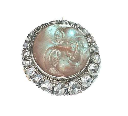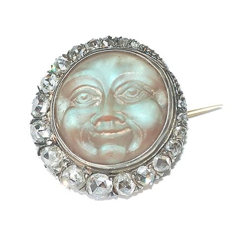 Sweet little man in the moon brooch, circa 1900. It is nine carat gold and silver and set with an opalescent glass moon face within a surround of colourless paste. The brooch measures one inch by one inch and is immaculate.