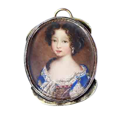 A late 17th century slide depicting Marie Mancini, first love of Louis XIV of France. Marie was one of five sisters whose uncle Cardinal Mazarin bought to the French court to make prestigious marriages. Thanks to their uncle’s intimate footing with the Queen Mother, Anne of Austria and her son Louis XIV, the sisters found themselves firmly ensconced within the royal circle. It was however Marie’s budding romance with the twenty year old King Louis that really caught the attention of the court. Although the couple had known each other since Marie’s arrival in Paris in 1654, four years later she and Louis were frequently spotted together in the gardens of Fontainebleau, the favourite romancing spot of French kings. Marie, an aristocrat but not of royal blood, was a decidedly unsuitable royal bride and in June 1659 Louis was informed in no uncertain terms that his affair with Marie was to end and that she would be leaving Paris. Hortense and Marie left Paris in the escort of their uncle. Louis begged to be allowed to say goodbye to his love but was permitted to only make a public farewell before she stepped into her coach. It must been a moving scene with the young king sobbing desperately before pressing his final gift, either a necklace or earrings of pearls into Marie’s hand. Marie was eventually married off to an Italian aristocrat, Lorenzo Onofrio Colonna and returned to her native Rome. This depiction of Marie in a sumptuous gown and wearing a pearl earring is painted in watercolour on vellum, under crystal. The slide measures one inch by 3/4 of an inch and has a later pendant fitting.