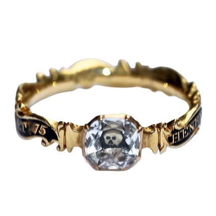 A memento mori skull hoop dated 1760. The high carat gold scrolled shank displays the details of the deceased on a black enamel ground : Henry Ray Gent ob. 7 Sep. 1760 AET 75. The central compartment contains a skull device under faceted rock crystal. The gold reverse of the ring is rayed. The ring is size O [US 7]. Tiny bit of enamel restoration.