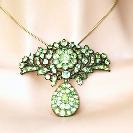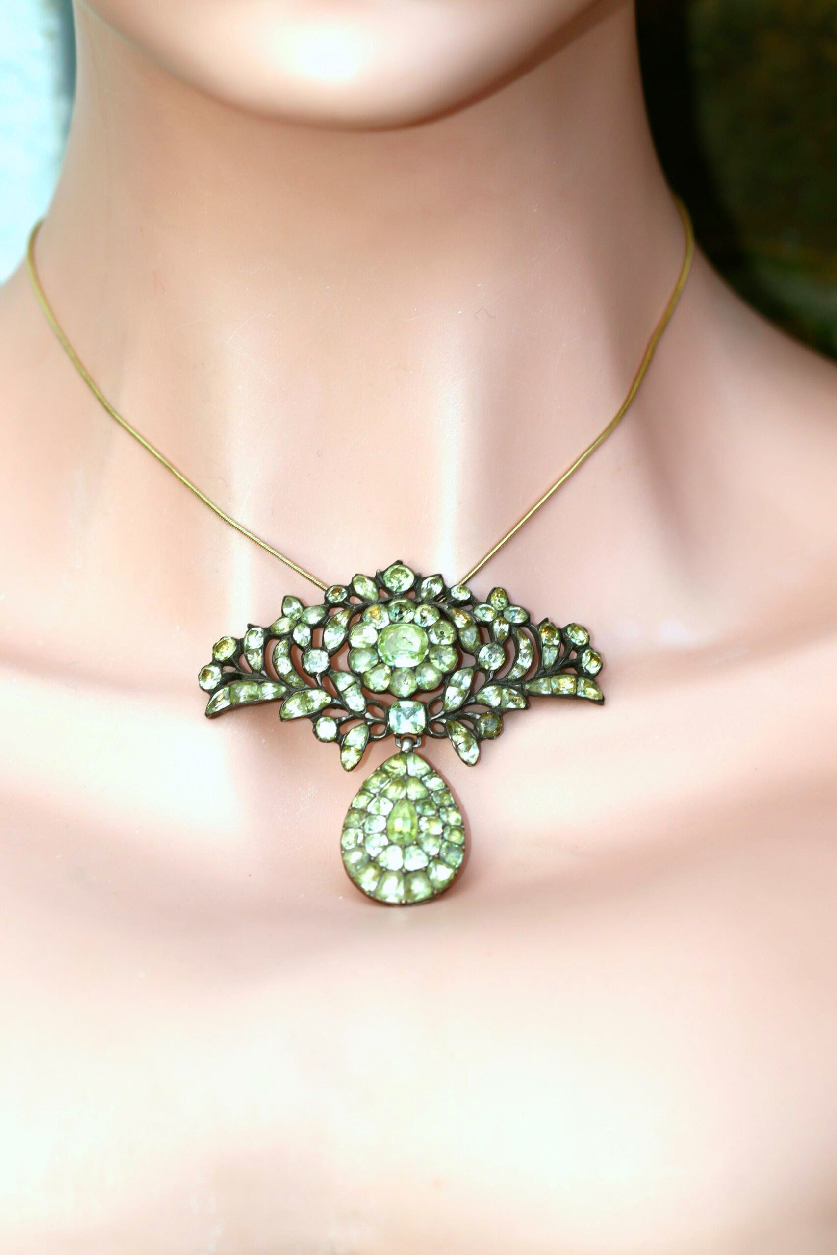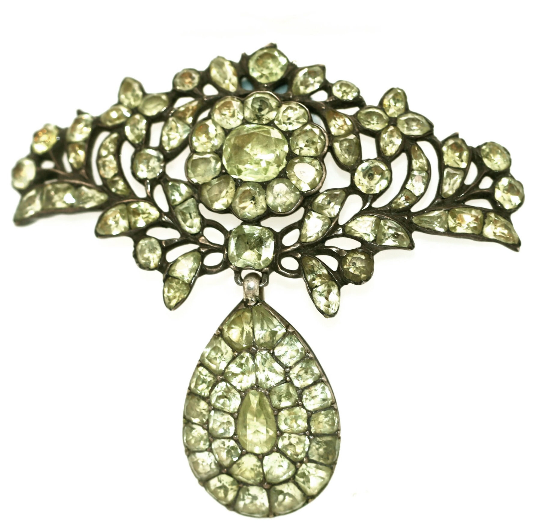 A substantial articulated Portuguese chrysoberyl pendant, circa 1780. It is silver and densely set with vibrant sea-green chrysoberyl in foiled and closed back settings. Chrysoberyl came from the Minas Gerais region of Brazil, a Portuguese ultramarine colony. Such richly hued gems became a distinct feature of 18th century Portuguese jewels. This pendant measures 3 inches by 2.5 inches. Completely original, in fitted case and immaculate.