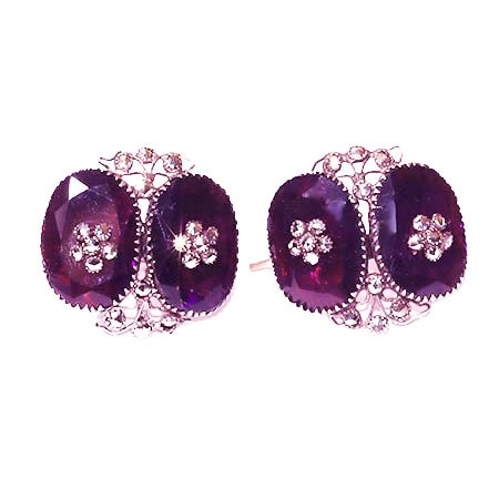 A pair of Queen Anne paste earrings, circa 1760. ‘Queen Anne’ is a jewellery trade misnomer, as Queen Anne died in 1714. As M.D.S. Lewis points out in ‘Antique Paste Jewellery’ : this style of jewellery took Paris by storm around 1730 to 1740. It is virtually certain that no such pieces existed in France or England before that date’. The earrings are silver set with deep purple amethyst paste and pyrites. The gold ear wires are later. They are a neat and wearable size, measuring 3/4 of an inch by 1/2 an inch. Not heavy on the ear and immaculate.
