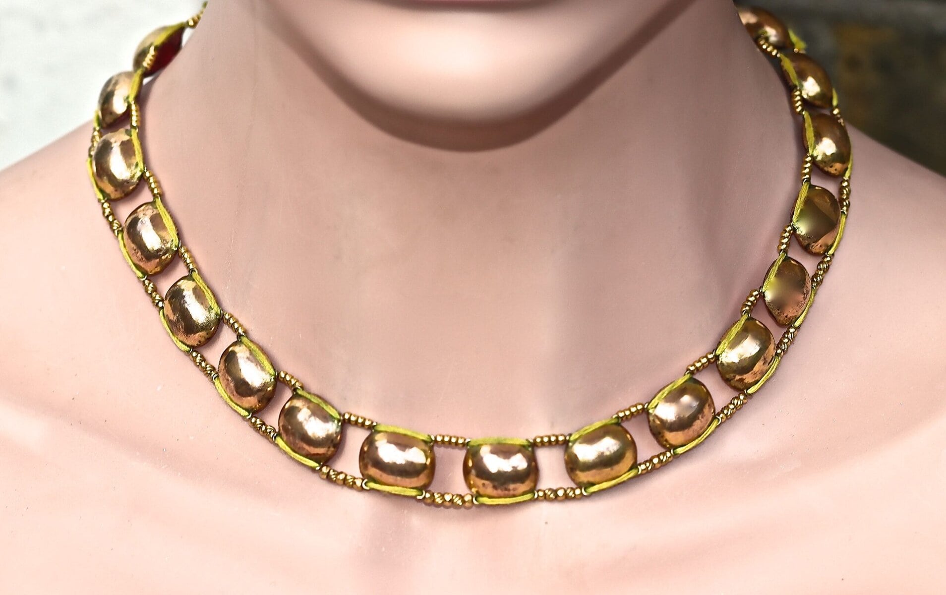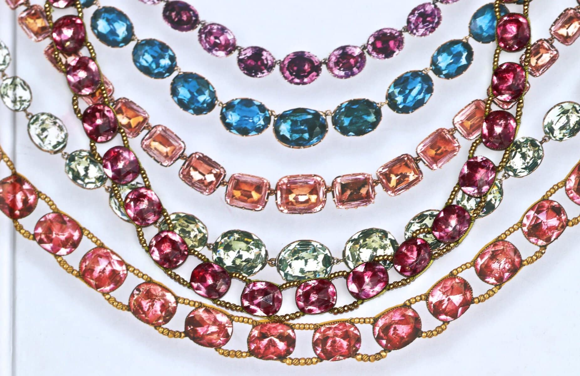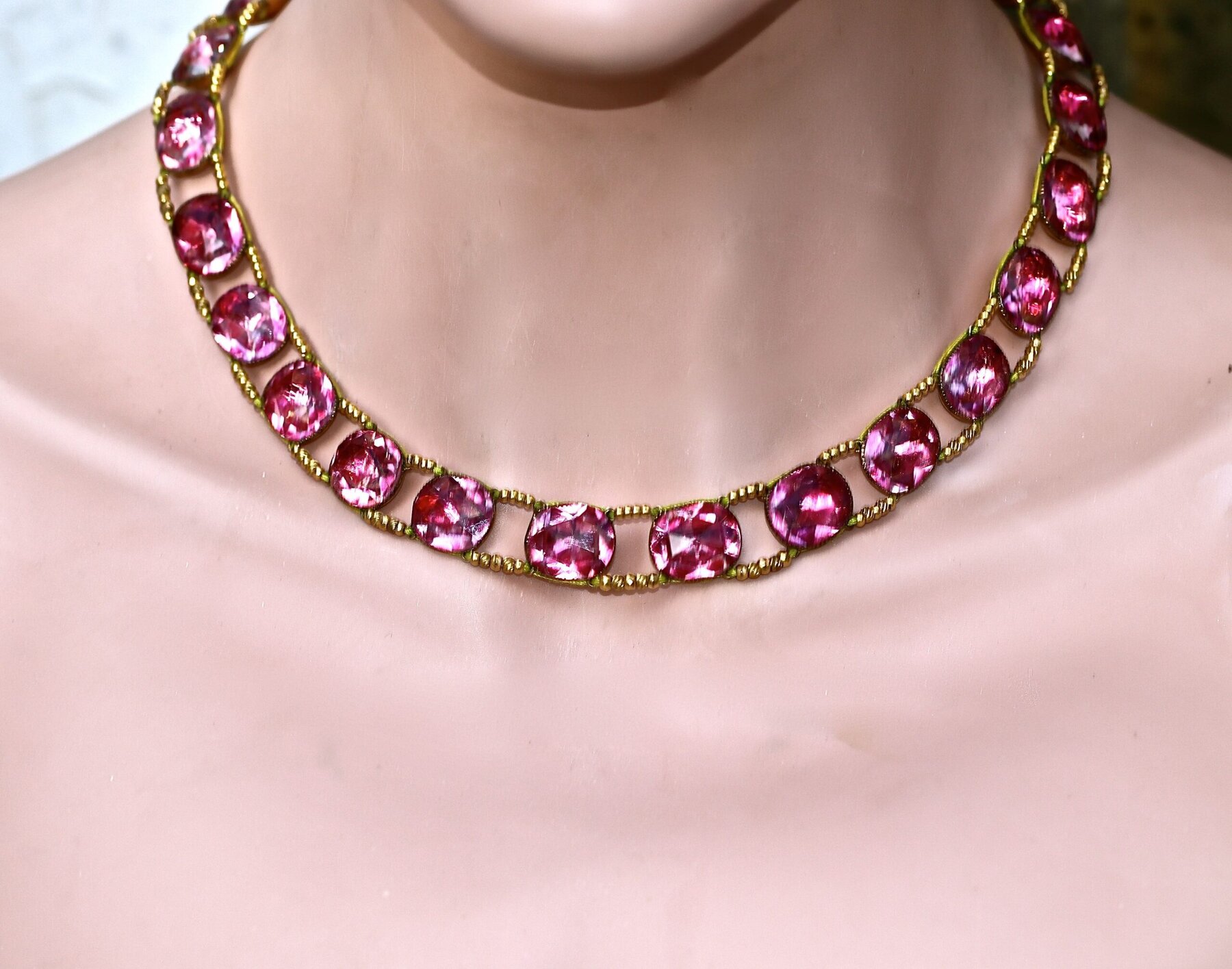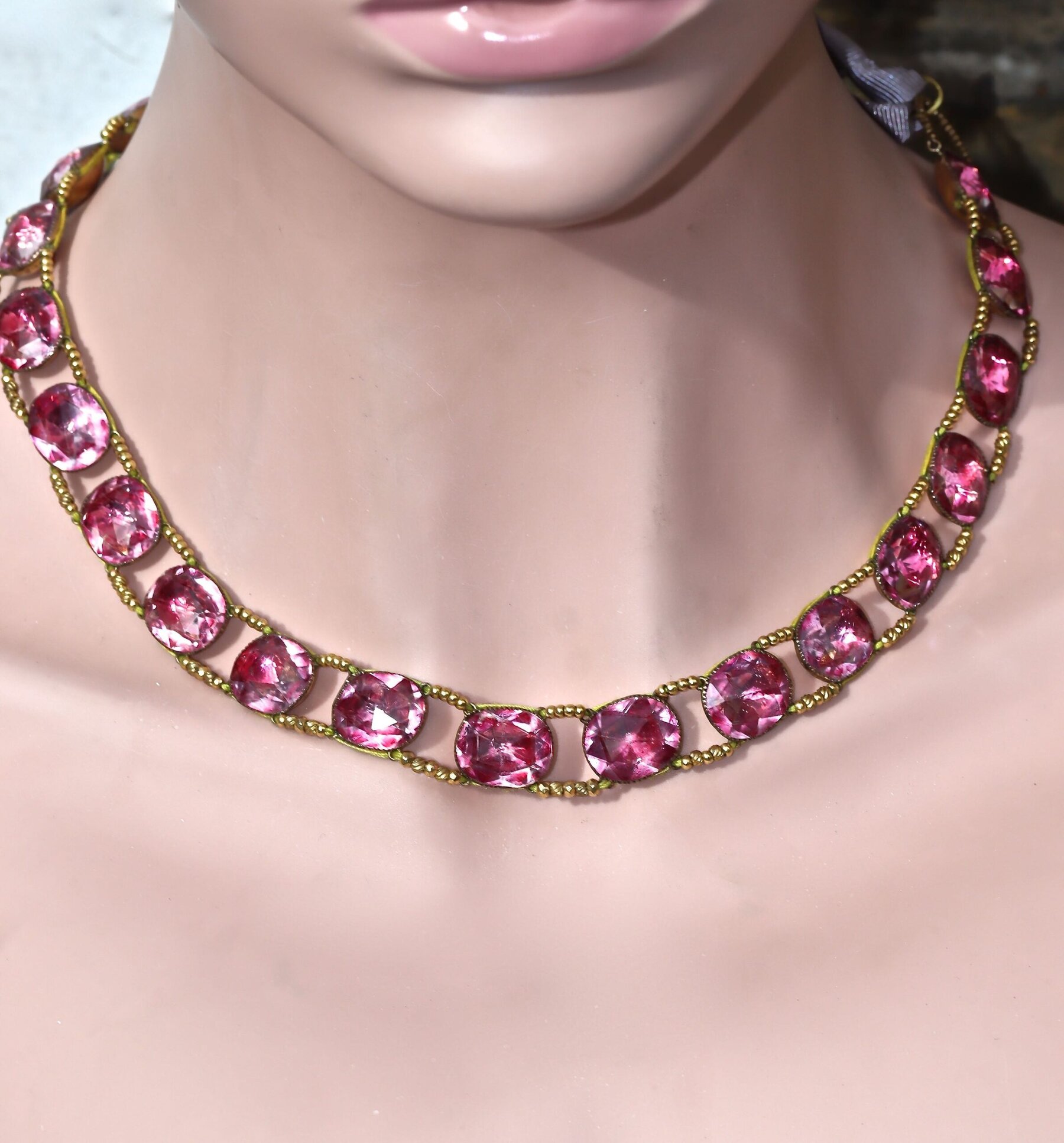 A ‘Queen Anne’ paste necklace, circa 1760, front cover illustration of the iconic publication Georgian Jewellery. It is gilt metal and set with dazzling magenta pink paste which has been foiled to catch and reflect light. Two technical developments in the late 17th and early 18th centuries led to the creation of luscious paste jewels. Around 1675 George Ravenscroft developed English lead flint glass with a brilliant lustre which was perfect for paste jewels. By 1730 G.F. Stras had become famous for his paste jewellery and was appointed Jeweller to the King of France in 1734. Not only did Stras make and sell fine diamond and paste jewellery, he also dealt in accessories such as foils and powders. His 1735 trade card states : he possesses in the utmost perfection the secret of making white sheets well , as well as those of all other colours. Paints all kinds of stones very advantageously equal to those of the Orient. Here you have the perfect example of the techniques developed by Ravenscroft and Stras : lead flint paste with a brilliant lustre set over vibrant magenta pink foil. The necklace is illustrated on the front cover of Georgian Jewellery and again on page 77 of the book. It is 14 inches long and 2/3 of an inch wide. As it has ribbon fittings it will fit a neck of any size. Utterly gorgeous thing.