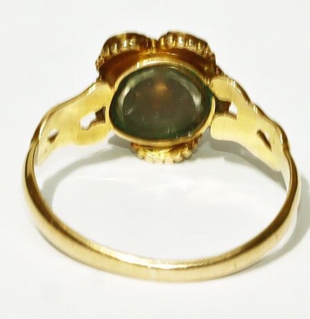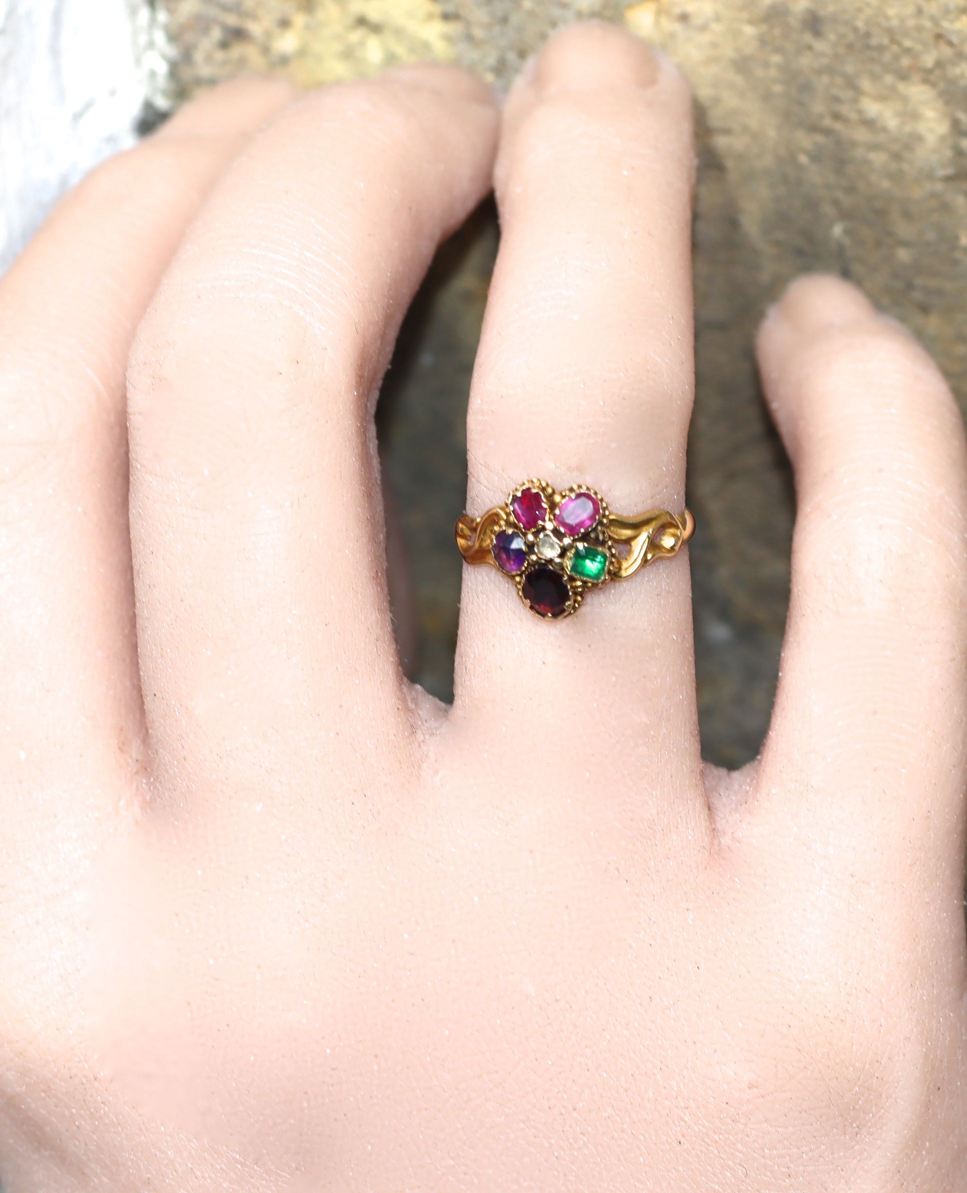 Sweet little sentimental ring, circa 1820. It is in the form of a pansy, symbolising pensée – think of the giver. The high carat gold pierced shank supports a pansy of gems spelling ‘regard’ in the acrostic manner – ruby, emerald, garnet, amethyst, ruby, diamond. The ring is size J [US 5 and 1/4] and can be sized up. There is a hair locket compartment to reverse. Immaculate.