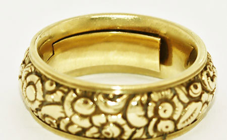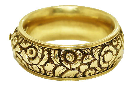 A solid, fine quality 18 carat gold hoop, circa 1830. The obverse of the ring is richly chased and engraved with cabbage roses. There is a secret locket compartment to interior which is opened by pressing a little button on the outside of the band. The ring is size N [US 6 and 1/2] and the band is 1/3 of an inch wide. Substantial and immaculate.