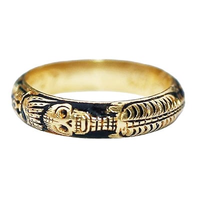 A weighty and superior example of a skeletal ring dated 1704. From the 16th century devices such as hourglasses, skulls, crossbones and skeletons appeared on items of jewellery, reminding the wearer of the brevity of mortal life and the necessity of preparing for life in the world to come. This high carat gold ring is encircled on the outer hoop by a full enamel skeleton, gravedigger’s tools and a winged hourglass symbolising tempus fugit or time flies. The ring is inscribed to interior : AS obt. 31 Oct 1704 Aet 47. The ring is size O [US 7] and the hoop is 1/4 of an inch wide. In extremely fine and completely original condition. For parallel examples see Plate 288 in Scarisbrick’s Historic Rings and the British Museum, Ashmolean Museum and V & A Museum ring collections.