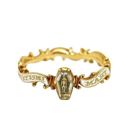 A superlative example of a memento mori coffin ring dated 1788. The high carat scrolled shank records the details of the deceased reserved on a white enamel ground : Mary Worthy Ob. 31 Jan. 1788 AE 4 Y’S 9 MO’S. The use of white enamel denotes the child’s innocent, unmarried status at the time of her death. The centre of the ring contains an upright coffin shaped compartment with a gold full skeleton under table-cut rock crystal. The rings is size P [US 7 and 1/2]. It is all original and the white enamel is in near perfect condition. The best example of a coffin ring I have seen for many years.