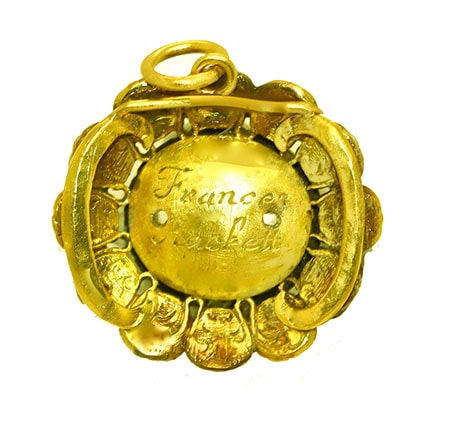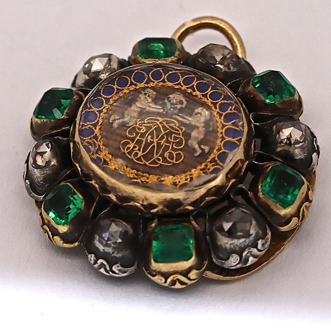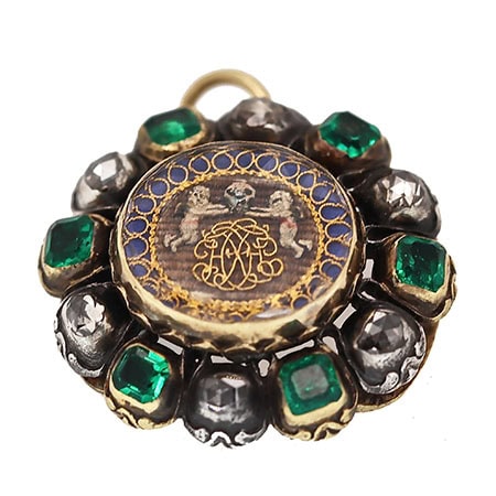 A Stuart crystal mourning slide, circa 1680. The high carat gold slide contains a compartment with a weave of hair surmounted by two enamel cherubs holding a skull aloft, above the gold wire work initials FH. The compartment is in a gold and silver surround set with Columbian emeralds and rose-cut diamonds. The emeralds signified true love and the diamonds constancy. To reverse the engraved mount has the name of the deceased: Frances Hackett. The original slide fittings are intact and the pendant fitting is later. The slide measures 3/4 of an inch by 3/4 of an inch. A most unusual example with a Columbian emerald surround, which I have not seen before.