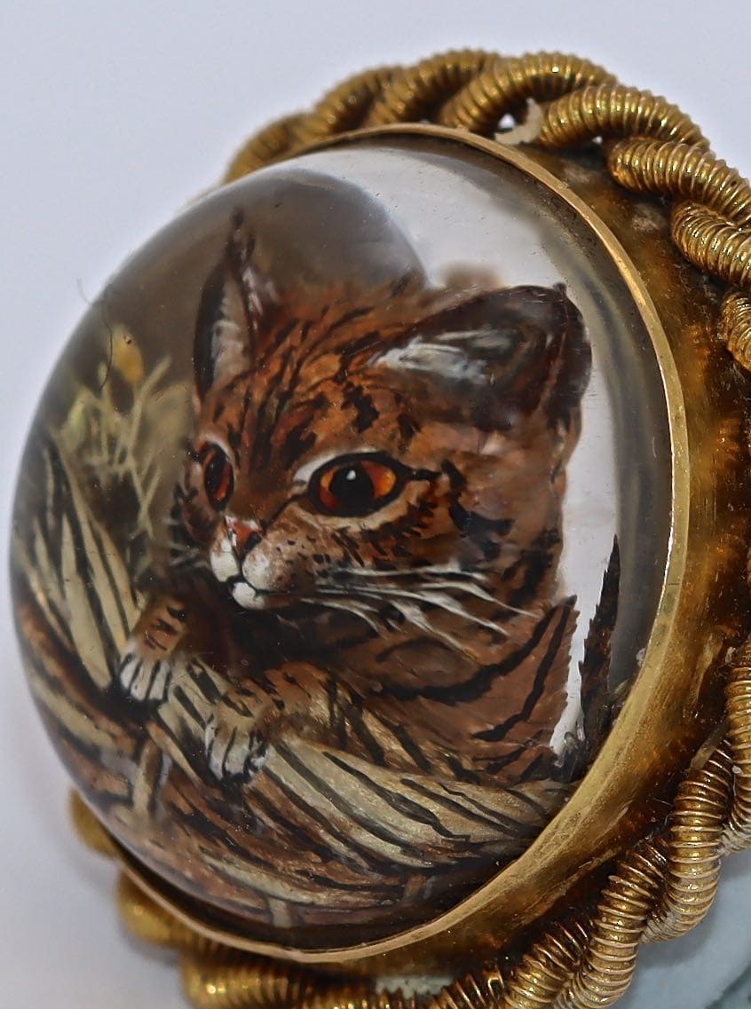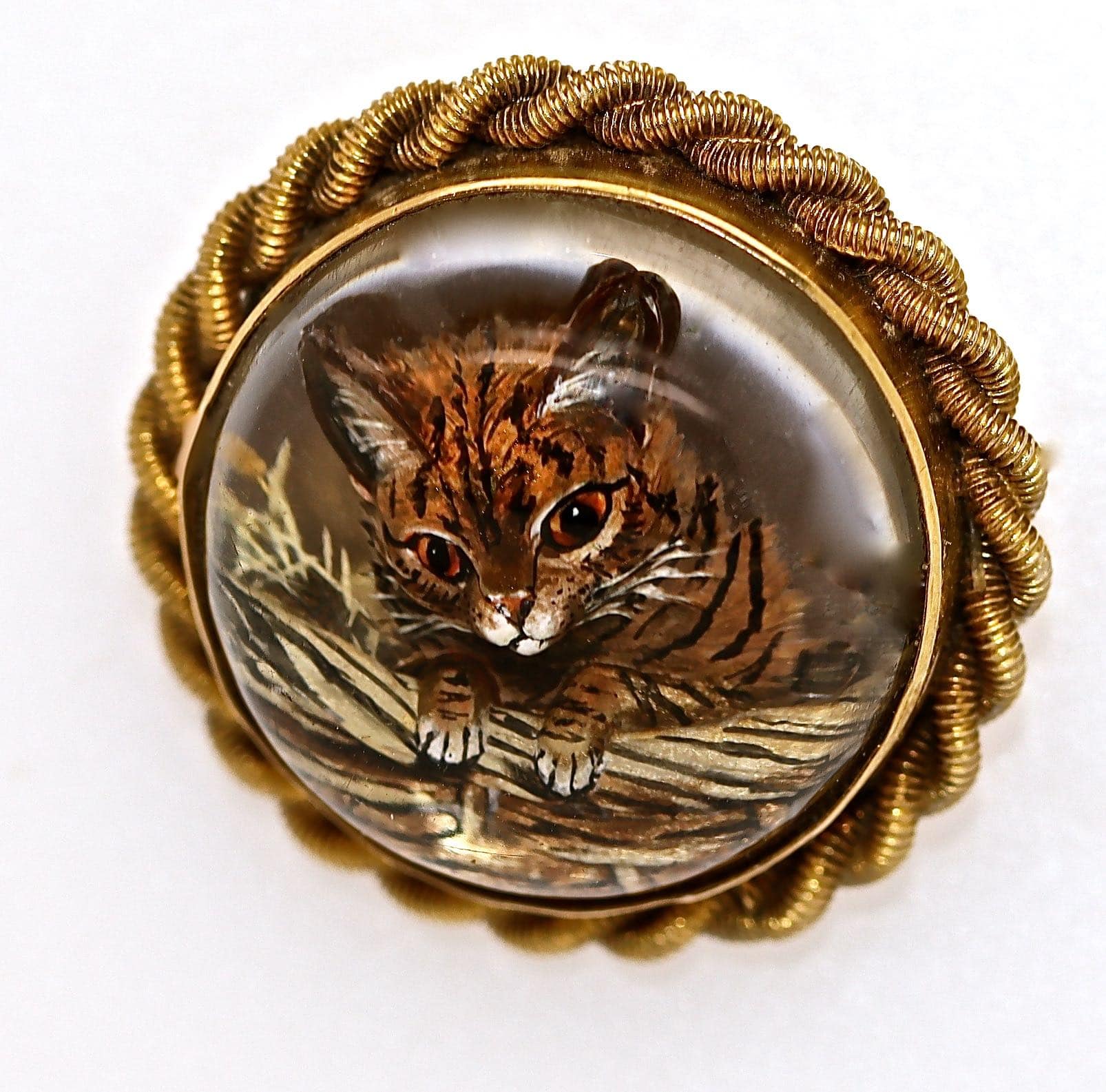 A reverse carved intaglio crystal of a tabby cat set to a 15 carat gold rope-twist brooch, circa 1890. The technique of reverse intaglio crystal carving required great skill, first carving out a domed rock crystal in intaglio and then painting the carving in fine detail. The tabby cat is depicted climbing out of a wicker basket. The effect achieved is photo-realistic. The brooch measures 3/4 of an inch by 3/4 of an inch. Well carved, immaculate.