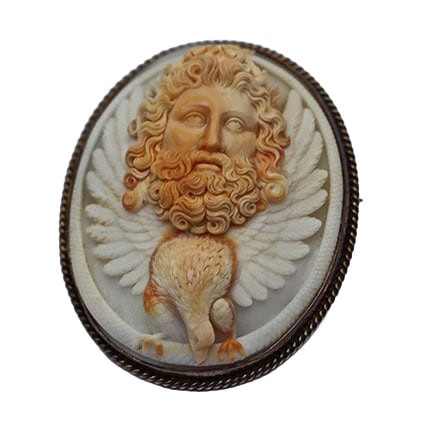 A bold and strong cameo carving circa 1870. The Horned Helmet shell carving depicts Zeus, King of the Gods, front facing aloft an eagle, his sacred bird. It is within an ouroboros surround and set silver. The carving is after the Zeus of Otricoli, an ancient Roman bust found in Otricoli in 1775 during the excavation financed by Pope Pius VI. It is on display in the Sala Rotonda of the Pio-Clementine Vatican Museum. The bust is presumed to be a Roman copy of a Hellenistic original. The brooch measures 2 inches by 1 and 3/4 inches. Skilful carving in three strata capturing the sense of the eagle about to take flight. Immaculate.